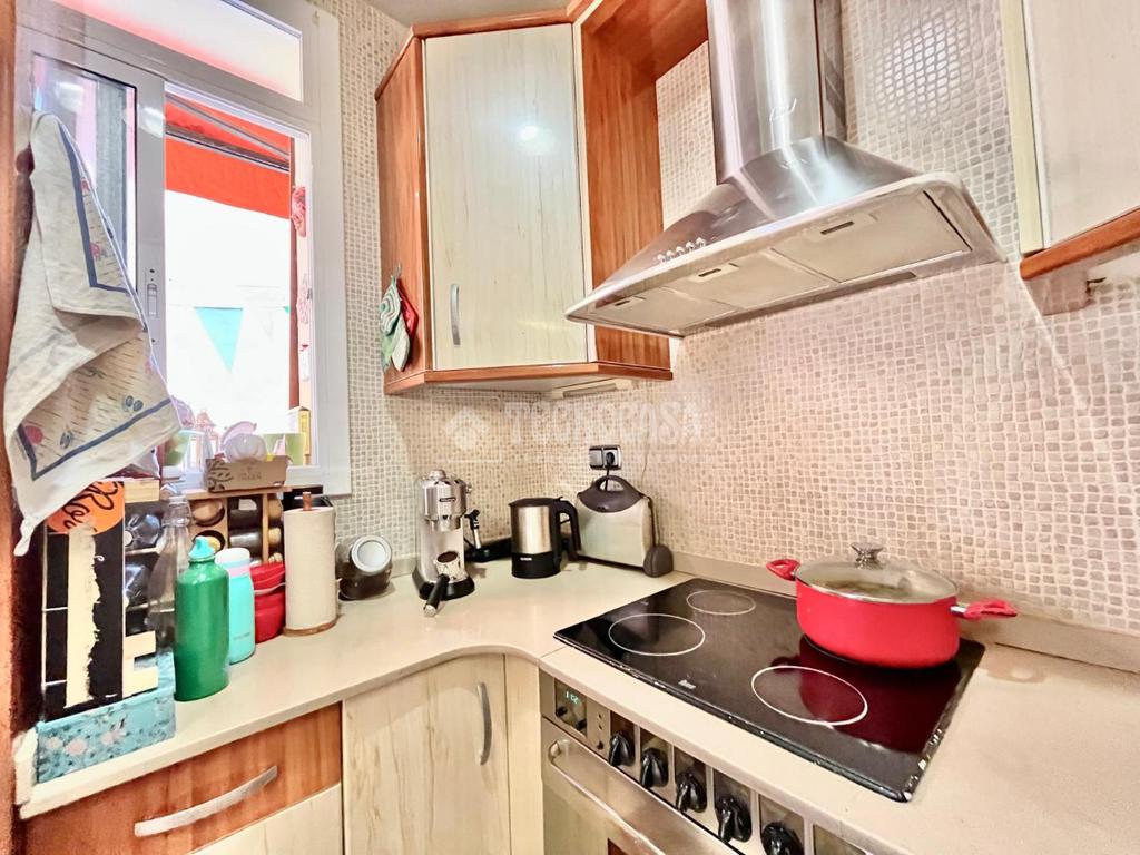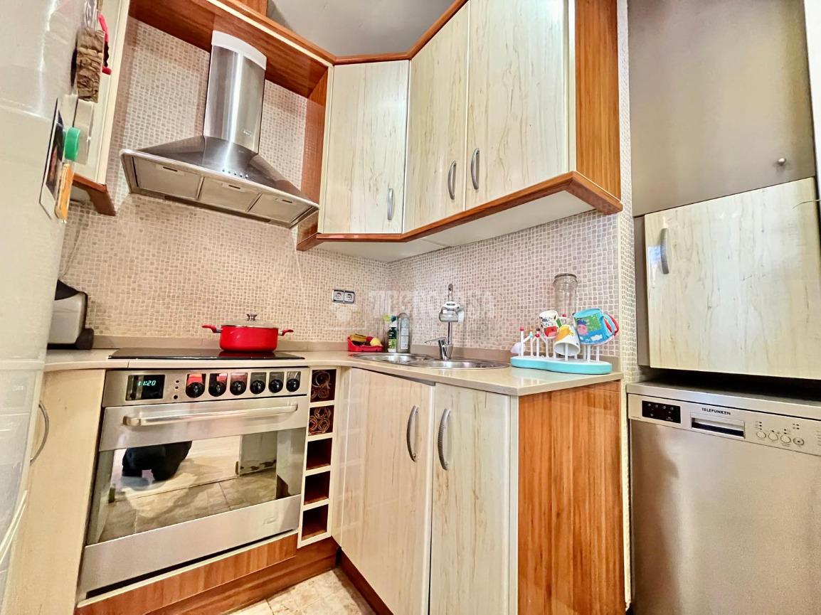 SALÓN-COMEDOR: Muy luminoso y espacioso con amplia terraza exterior a patio de manzana, con suelo de parquet. Cocina americana equipada con cocina vitrocerámica de 4 fuegos, campana extractora, horno, fregadero de 2 senos, frigorífico, lavavajillas y armarios de almacenaje, ventilado a la terraza.